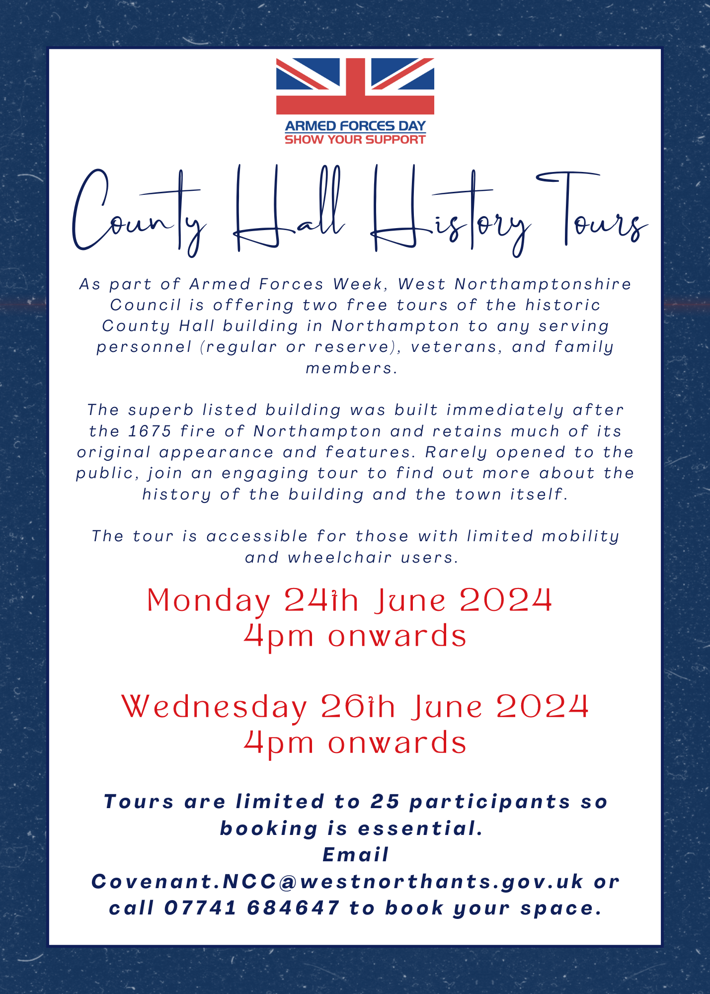 – Free history tours of County Hall Northampton for members of the Armed Forces Community – Monday 24 June at 4pm and Wednesday 26 June at 4pm