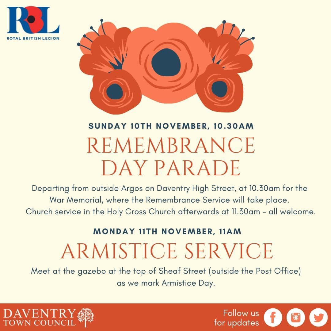 The annual Remembrance Parade will step off at 10:30am from outside Argos on Daventry High Street. The parade will process to the War Memorial for a short service to include Roll of Honour, wreath laying and 2-minute silence. This will be followed by a Remembrance Day service at Holy Cross Church at 11:30am.
