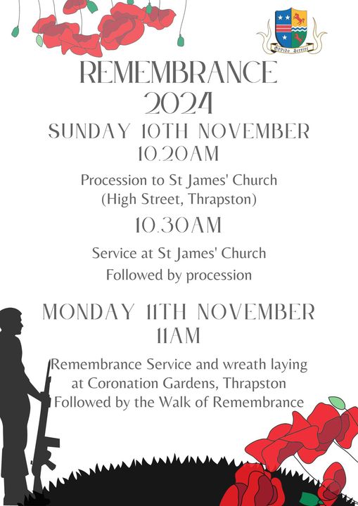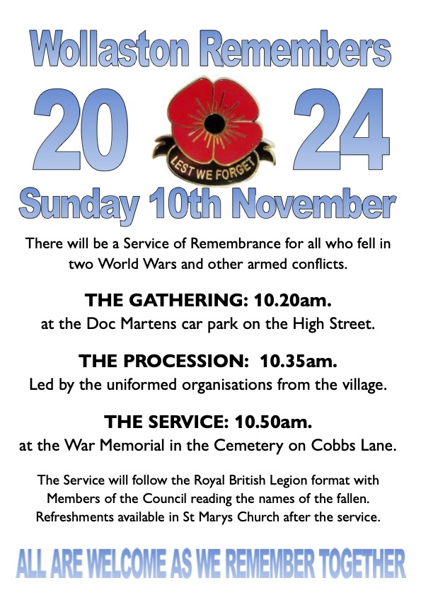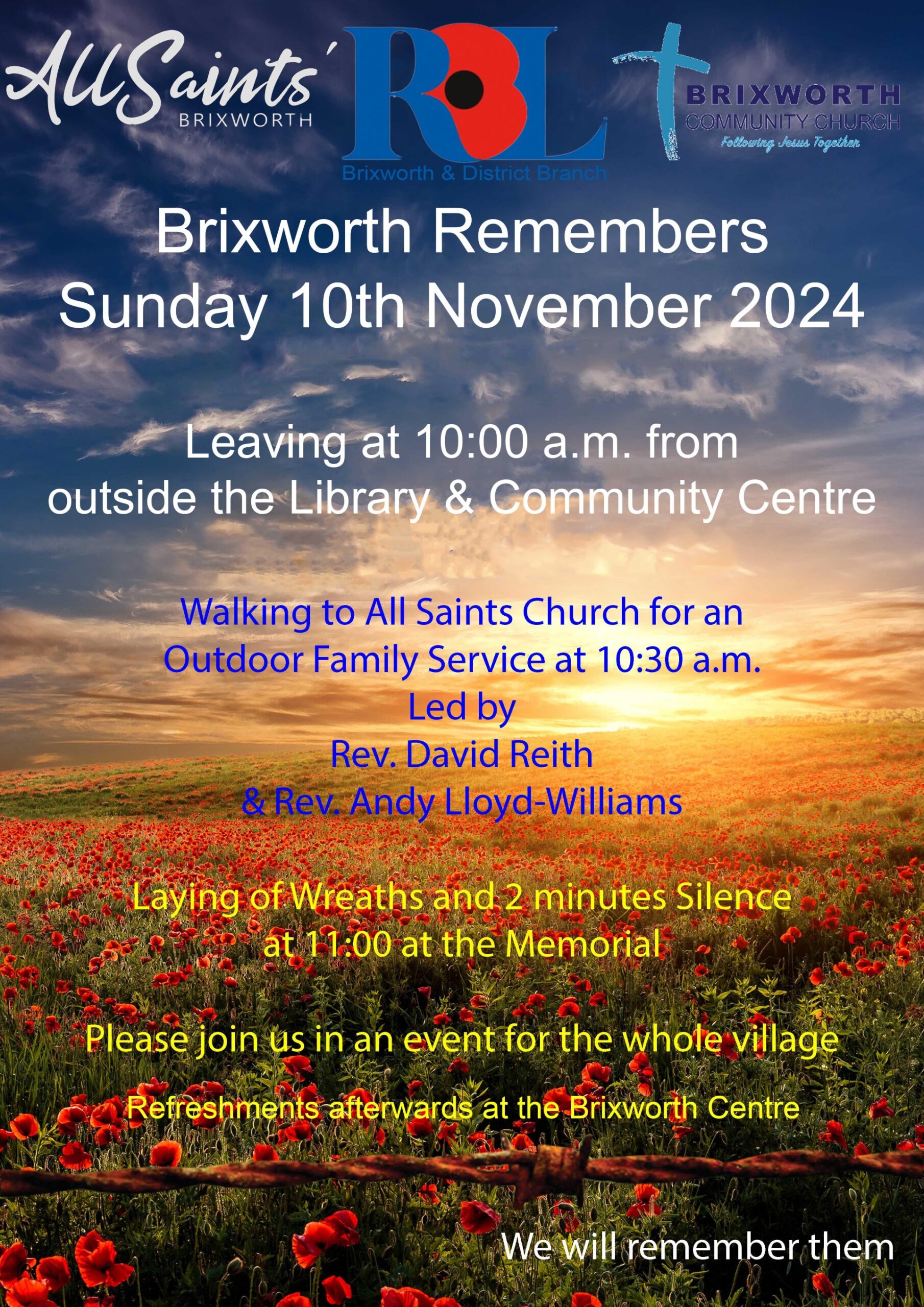 The Brixworth Remembrance event begins at 10am outside the Library and Community Centre and will walk to All Saints Church for an outdoor family service at 10:30am. This will be followed by wreath laying and 2-minute silence at 11am at the Memorial.