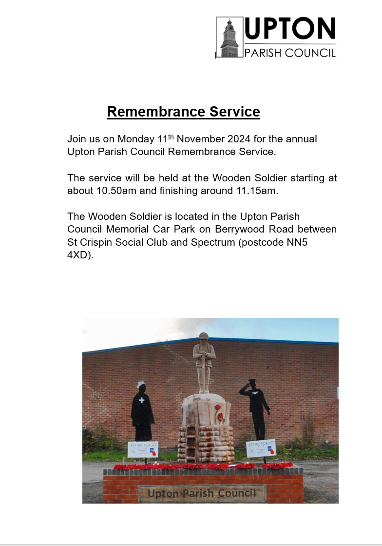 A Remembrance Service will be held at 10:50am at the Wooden Soldier in Upton Parish Council Memorial car Park on Berrywood Road. You can find it between St Crispin Social Club and Spectrum.